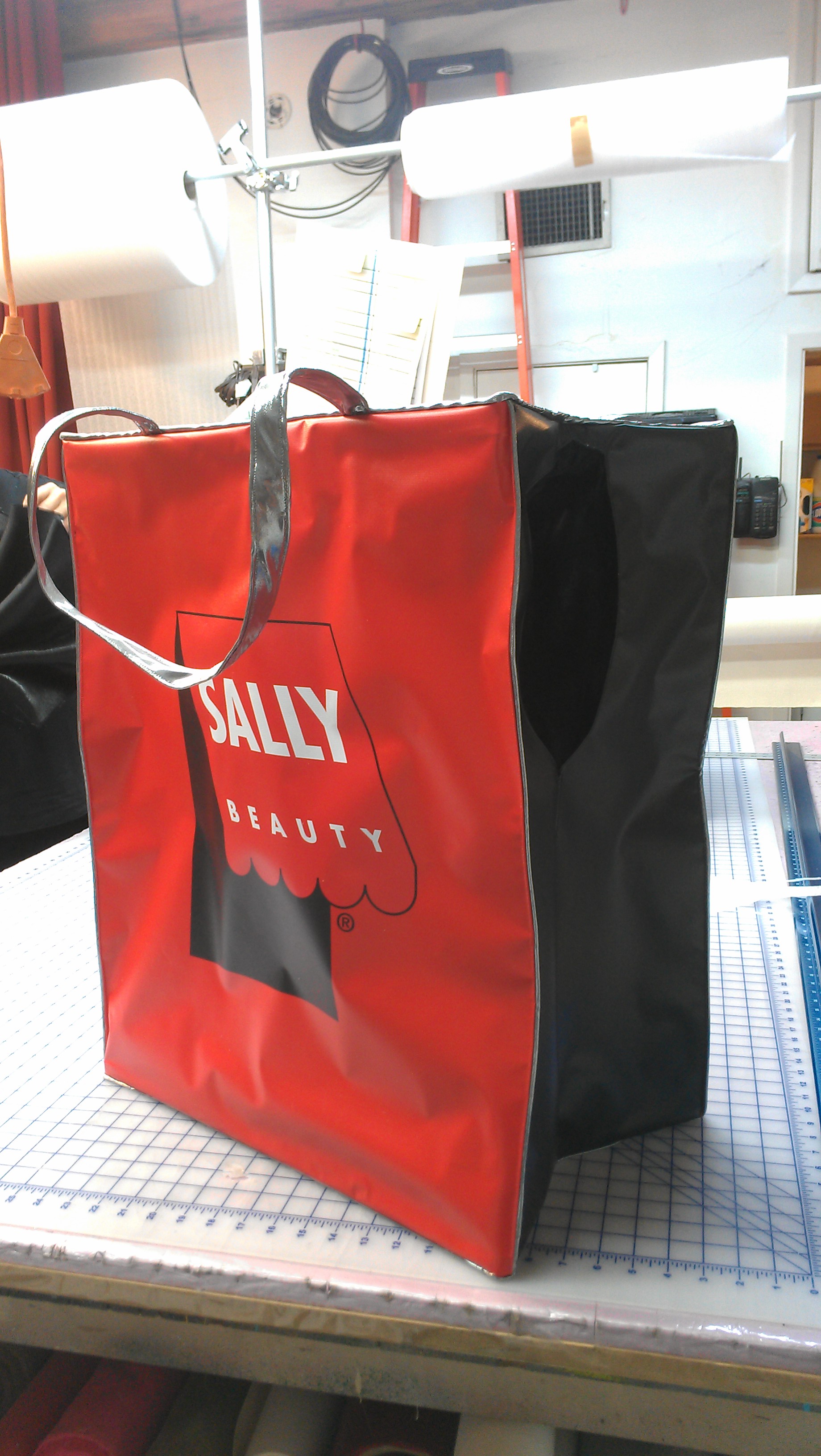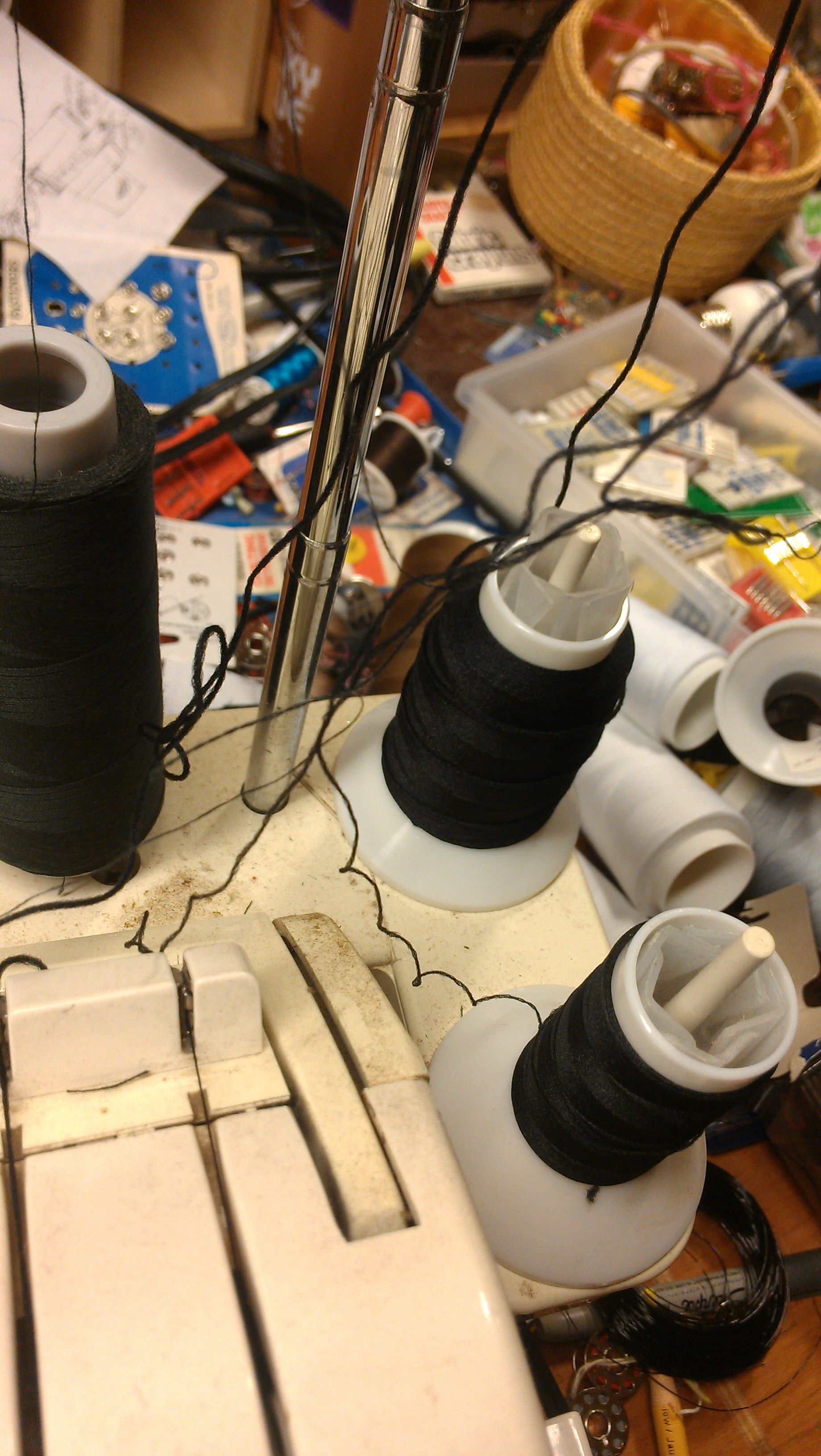 I had brought the scrap terrycloth more as padding for transporting my sewing machines than anything else. Once I collected all the costumes–except, ironically enough, for the prototype, which fit perfectly–I set up my sewing machines.