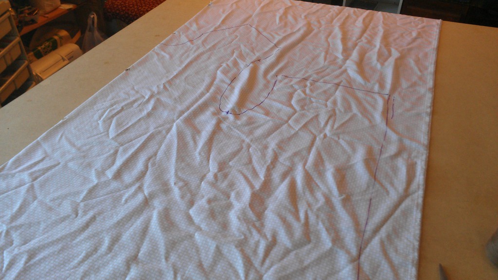 Then I took the sleeves down a bit to be able to squeeze them in tighter on the narrow fabric. I was still annoyed by the wasted fabric triangle between them, but later realized that the pants, wide as they were, were not wide enough to go around the slippers they were to be sewn to. Adding a triangle godet on the back seam saved them.