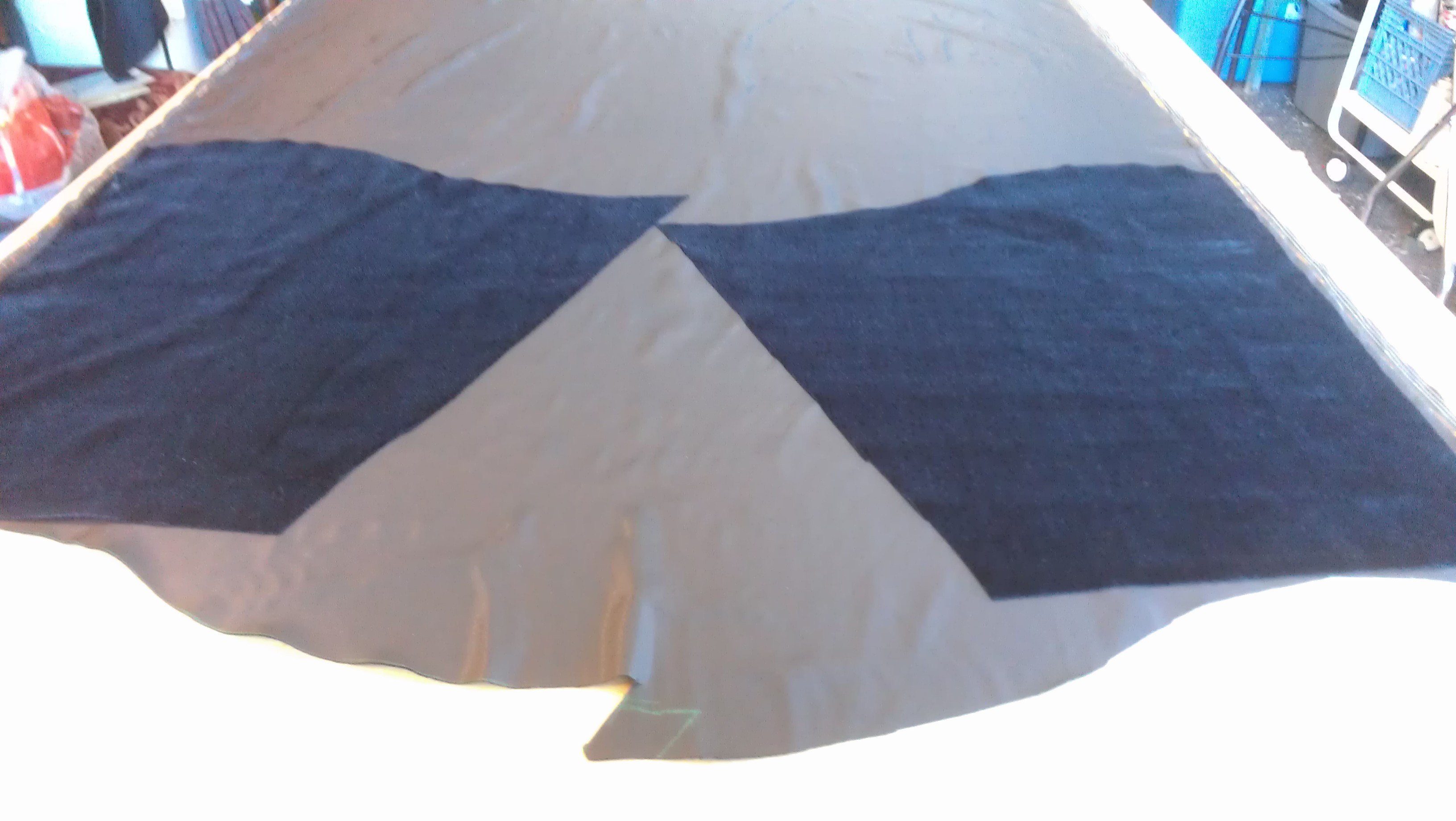 A last-minute realization that a giant triangle needed to come down from the peak and stretch to the side curtains gave me a couple days to get it done. Of course, this also coincided with my phone’s battery, and thus camera, going on the fritz, so no pictures of the 20′ triangle. .